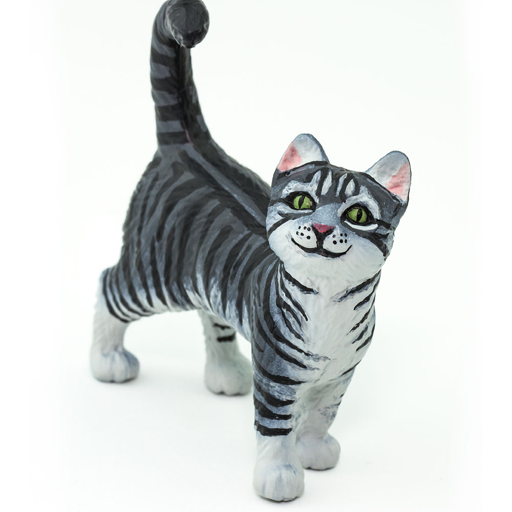 Caracteristicile pisicii tigrate sunt: variații ale culorii de gri a blănii, dungi verticale sau care urmează un anumit tipar. Figurina noastră redă figura unei pisici cu o expresie curioasă și are coada răsucită.