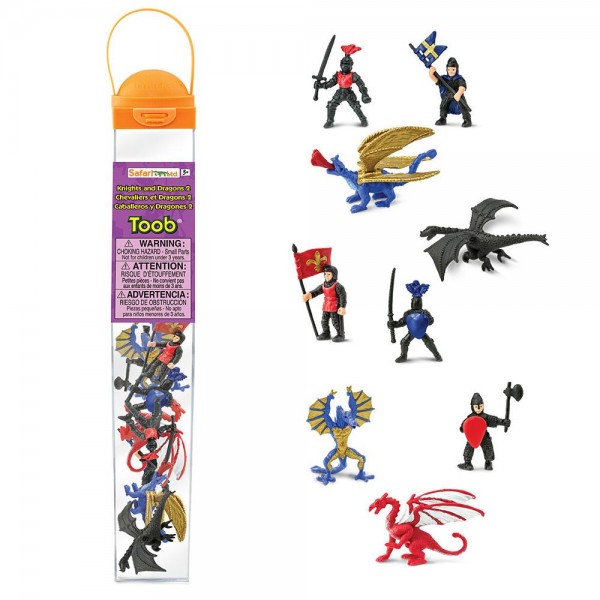Pregătește-ți calul și călărește pentru a te întâlni cu dragonii fioroși! Acest tub conține: un cavaler cu lance, un cavaler cu topor, un cavaler cu o sabie cu două tăișuri, un cavaler cu o sabie măreață, un sulițaș și dragonii Peluda, Wyvern, Tiamat și Drake.