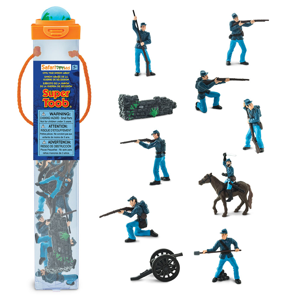 Set tematic de colecționabile Safari, care conține 11 figurine ce ilustrează Războiul American de Secesiune. Tubul este foarte util pentru păstrarea colecției și pentru călătorii. Figurinele sunt pictate manual. Istoria este importantă și lecțiile ei la fel. Prin joacă, lucruri serioase și chiar tragice, pot deveni mai ușor de înțeles și explicat. Războiul American de Secesiune dintre 1861-1865 a fost un moment cheie în istoria SUA, care a avut multe cauze, dar una majoră a fost sclavia. Iată un tub tematic care pe lângă partea ludică, va asigura deschiderea unei teme importante de discuție cu copilul și o lecție educativă. Jucărie de rol care stimulează imaginația, creativitatea și spontaneitatea copiilor. Lasă copilului posibilitatea de a crea scenarii multiple de joc. Nu conține ftalați sau plumb! Vopseaua nu este toxică! Dimensiune: Dimensiune tub: 5 x 5 x 33 cm. Dimensiune figurine: între 5 și 7,5 cm.