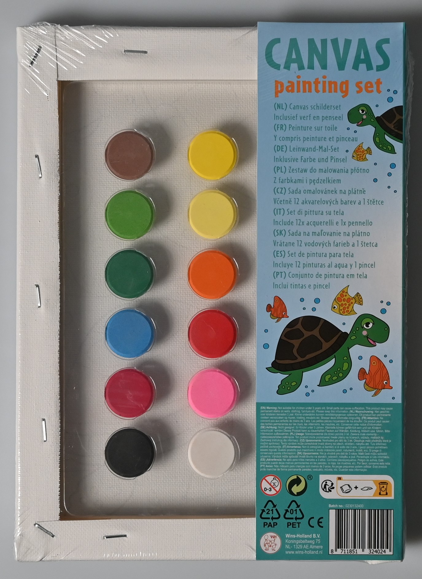 Set de pictură care include 1 tablou din pânză cu desene contur de pictat, o tăviță cu 12 culori de acuarelă și 1 pensulă. După finalizare, poate deveni un tablou decorativ în casă sau un cadou de oferit cuiva drag.